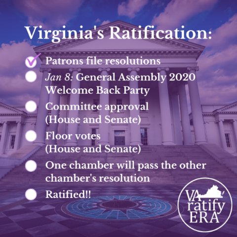 We are off and running towards state 38–as State Senator Jennifer McClellan in the Senate, and Delegate Jennifer Carroll Foy in the House, filed resolutions to ratify the Equal Rights Amendment. McClellan and Carroll Foy are Chief Patrons of the ERA bills in their respective Houses. Senator Mamie Locke submitted a third ERA resolution, punctuating Virginia’s intent to take up the matter early, and ratify early. Here are releases from McClellan and Carroll Foy–and thanks to VARatify ERA for this checklist of what happens next.