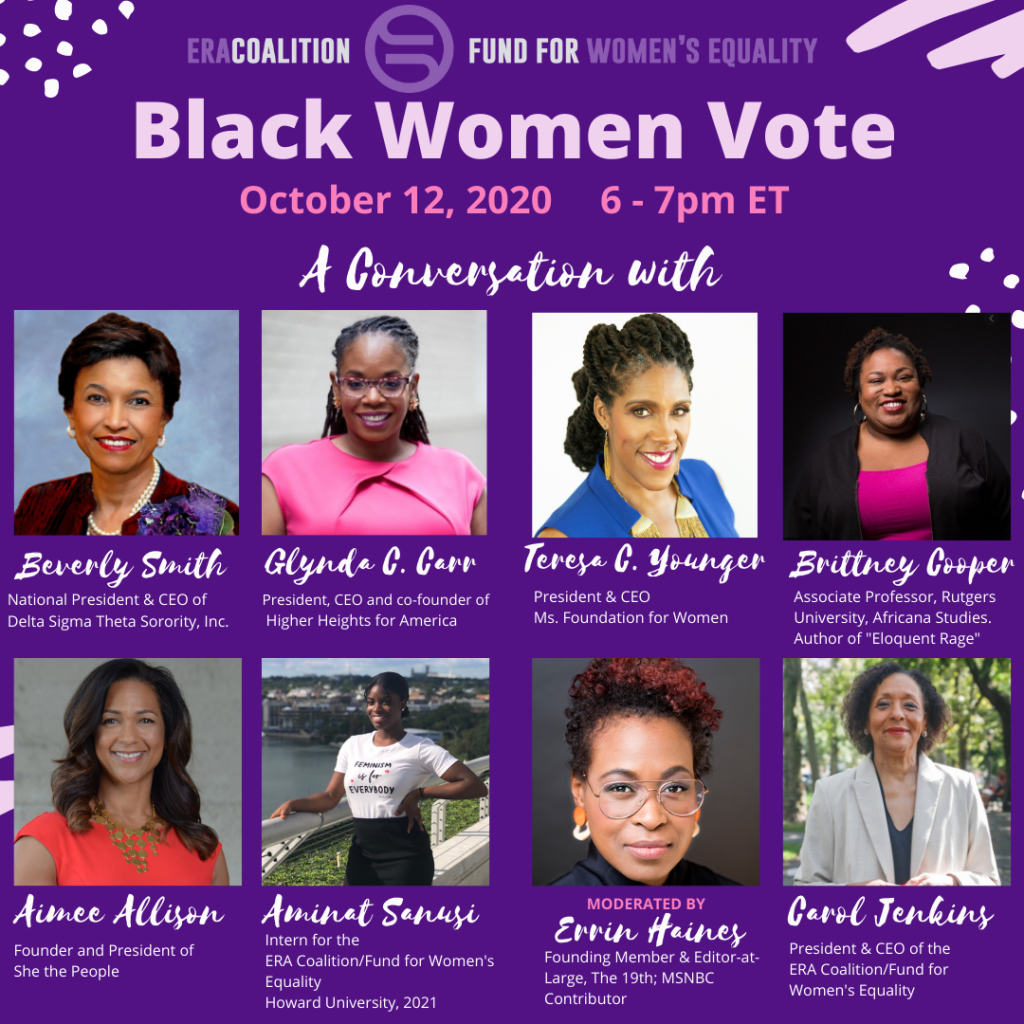 Beverly Smith, President and CEO of the sorority Delta Sigma Theta, which has hundreds of thousands of members, is joining our Black Women Vote Town Hall tonight. We are so pleased that the Deltas are now members of the ERA Coalition.