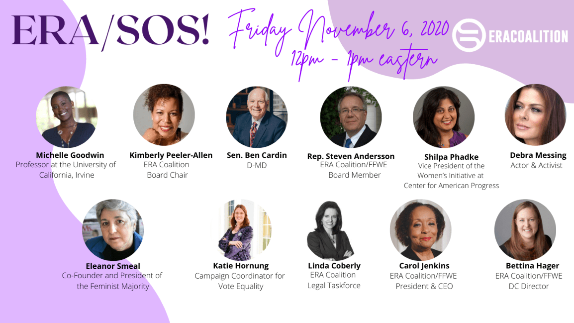 Speakers include Senator Ben Cardin, lead sponsor of SJ Res 6, removal of the time limit on the ERA bill in the Senate, and actor/activist Debra Messing.