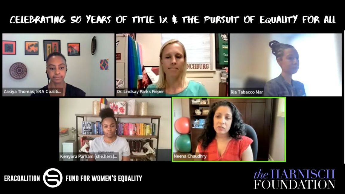 Equal Rights Amendment Coalition CEO & President Zakiya Thomas welcomed everyone to this month’s featured town hall regarding Title IX – discussing where this landmark legislation currently stands, and where we want to bring it today and in the future. Thomas thanked those who could join today to contribute to these important discussions in celebration of the 50th anniversary of Title IX’s passing, and gave extra thanks to the day’s guest speakers in their efforts to ensure that Title IX is maintained and enforced in terms of both the letter and spirit of the law.