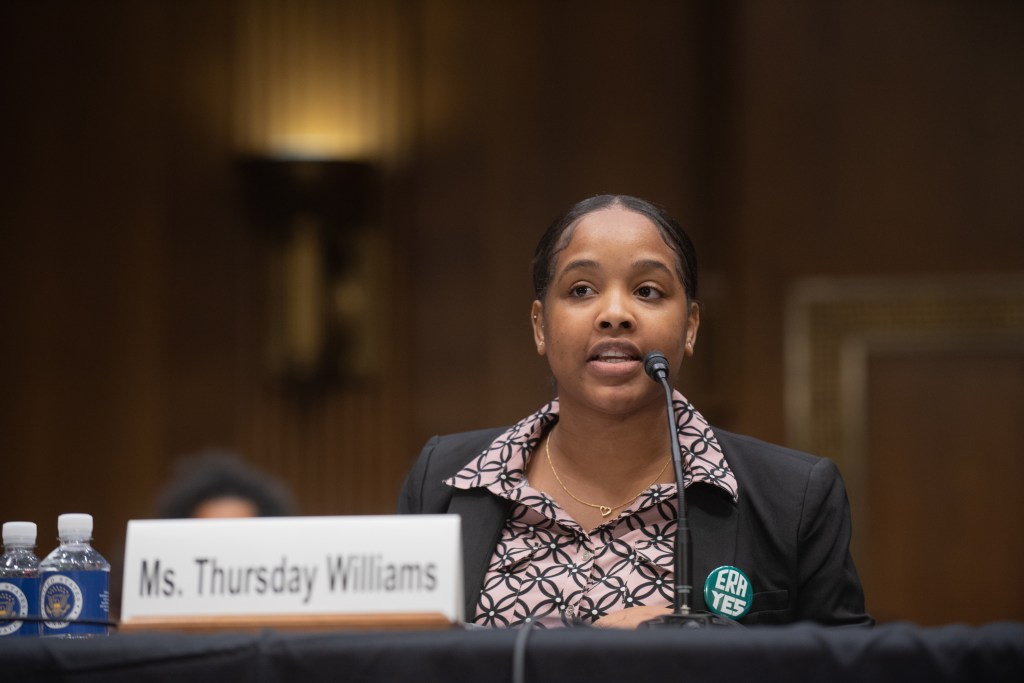 Thursday Williams, a college student, former cast member of What the Constitution Means to Me, and ERA Coalition Board Member was third to speak at the committee hearing. “Speaking for my generation, the Equal Rights Amendment holds a brighter future for us all.” Williams explains that her family moved to the U.S. seeking the American dream of education and productivity, and her mission is to fulfill that dream. She fell in love with the U.S. Constitution in high school, and admires most how brilliantly it was designed to adapt to the ever-changing minds of the people. She continued to explain that it was not so long ago that she would not have had the opportunity to stand on a stage in a major production as a Black woman, yet here she is defending a Constitution that once considered her 3/5s of a person. In 2023, it is still not yet explicit that she is equal to a man; that all people should be treated equally regardless of sex. This document was not written for her, and was not written for any women and it needs to be amended, Williams reminded attendees.