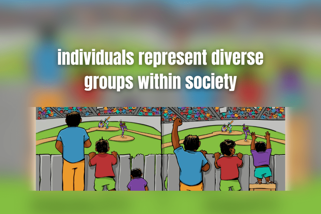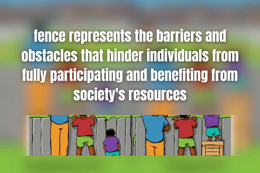 At the furthest end of the illustration, the fence is removed altogether, enabling everyone to enjoy the game without barriers. This powerful image emphasizes the importance of dismantling structural and societal barriers that disproportionately affects marginalized communities.