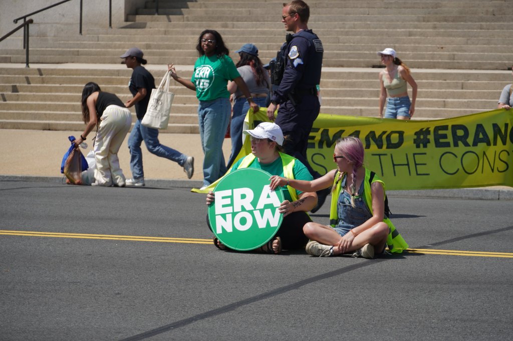 The young activists of Generation Ratify continued to amplify their message through radical protests. On 17 August 2023, a group of activists occupied Constitution Avenue, a key road in Washington, without obtaining any official permit. During peak traffic hours, they assembled near the National Archives building. The group, which included members as young as 14, equipped their megaphone and boldly stepped into the street’s eight lanes. They then displayed their eye-catching banner, which loudly proclaimed: “WE DEMAND #ERANOW” and “PUT US IN THE CONSTITUTION,” pressing the national archivist to officially publish the ERA as the 28th Amendment.